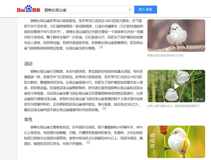 上面这个是百度百科“银喉长尾山雀”词条下面的内容截图,右边这些相关的视频介绍说的是银喉长尾山雀,但是图像展示的都是北长尾山雀。